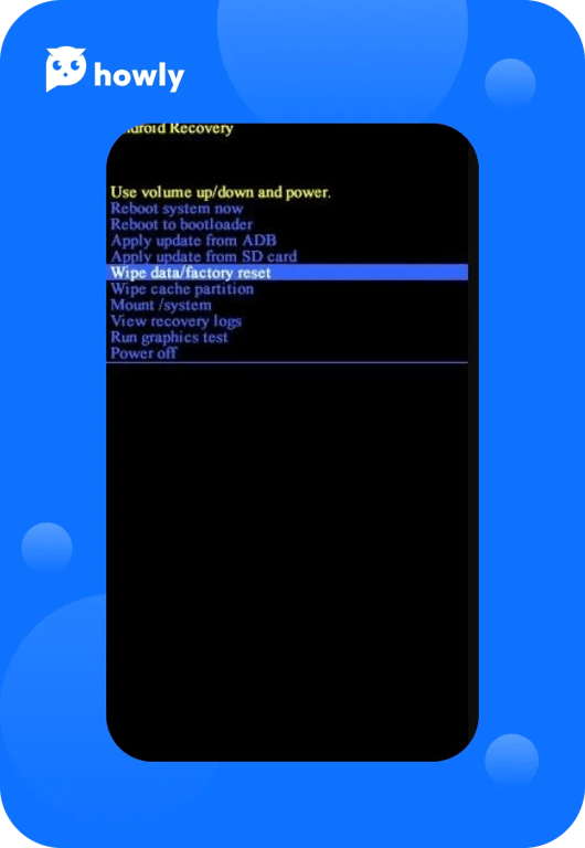 - Look for the Wipe data/Factory reset line. You can navigate with the Volume keys and use Power to select.