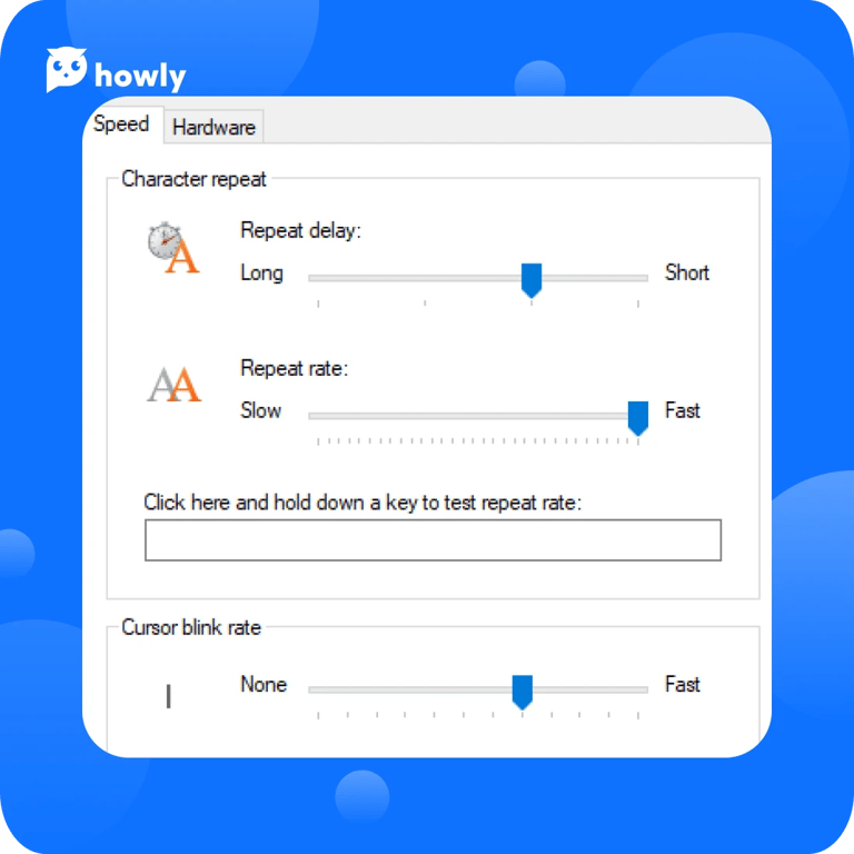 - Change the repeat and blink settings on the Speed tab. In the Hardware tab, you can update or roll back drivers to built-in and external keyboards.