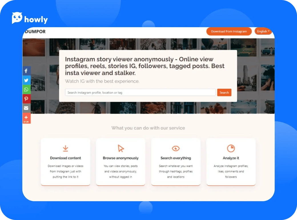 This service is ImgInn similar site (ImgInn, Img Inn). The functionality is identical but ads are fewer. Though Dumpor promises that you can watch other people's stories, this feature is unavailable at the moment. Here is the list of currently available features of Dumpor: